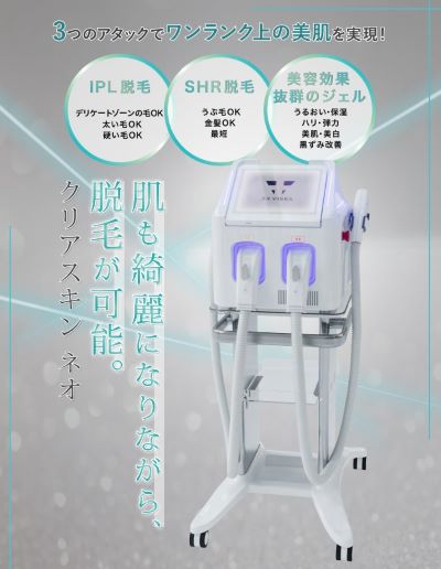 IPL方式とSHR方式を組み合わせた「クリアスキン脱毛」の技術をマシンに取り入れています。